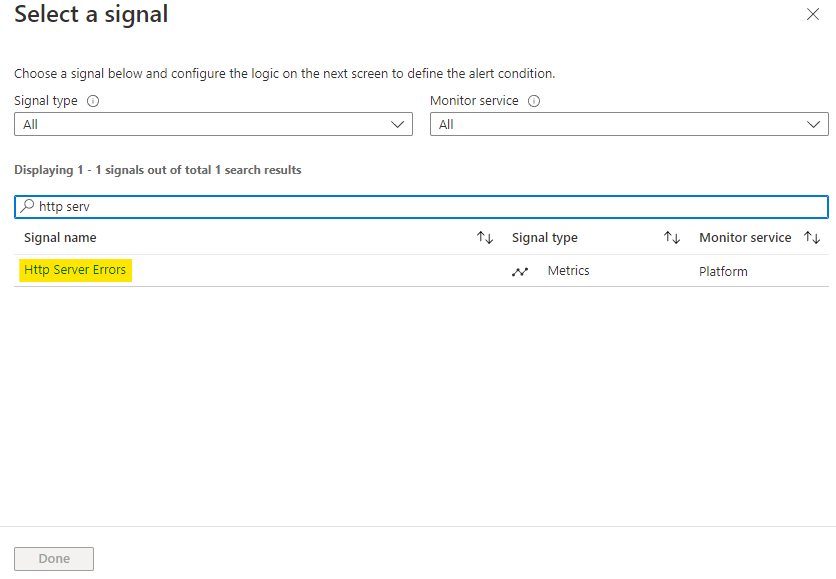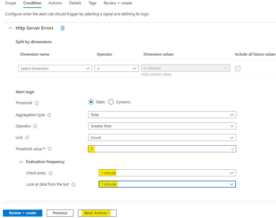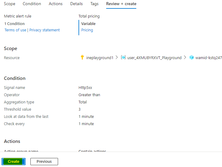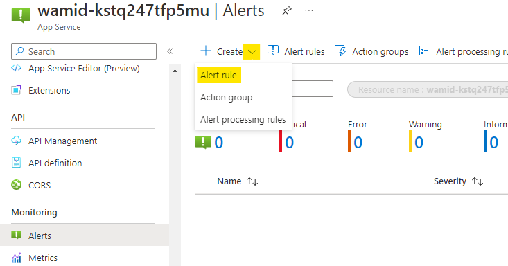 After the action group is created, go back to the alerts for your web app. Click on Create and select Alert rule to create a new alert rule.