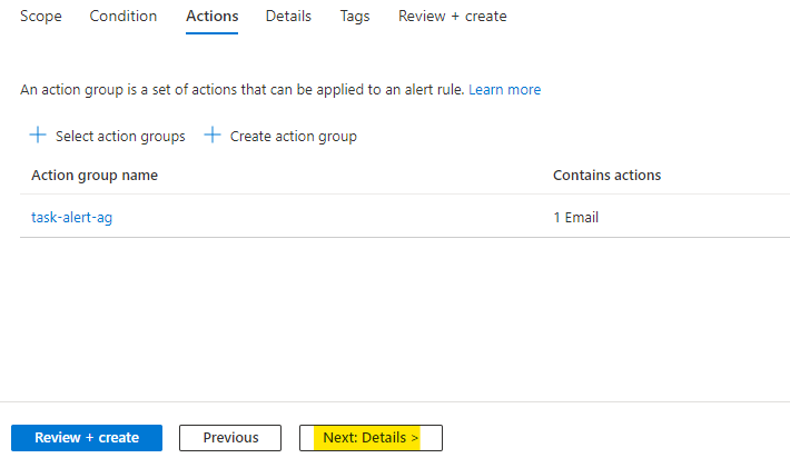 After the action group is selected, click on Next to enter the details for this alert rule.