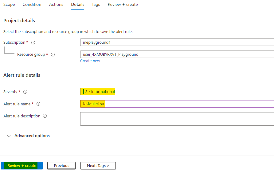 Set the severity level to 3 and name the rule as task-alert-ar. Click on Review + Cretae.