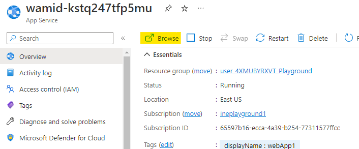 Go to the overview of the web app and click on Browse to open the web app in new tab.
