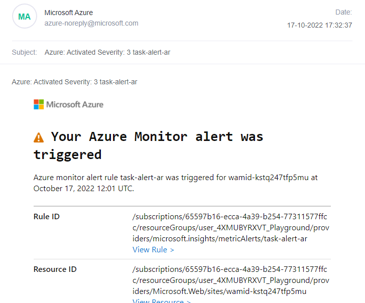 Wait for 5 to 10 minutes and you will get an email of your mail address from microsoft. You will see that the alert was triggered.