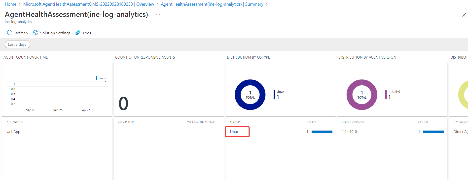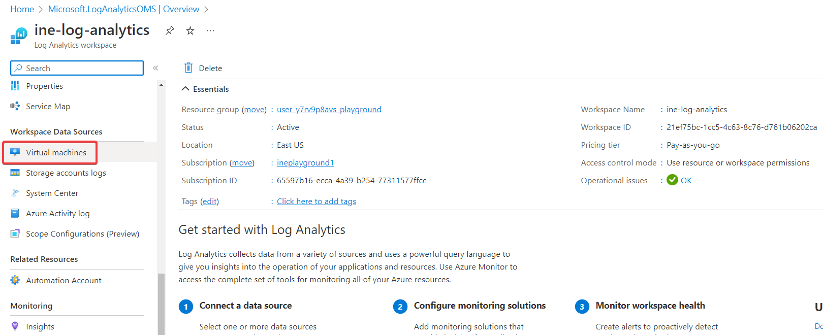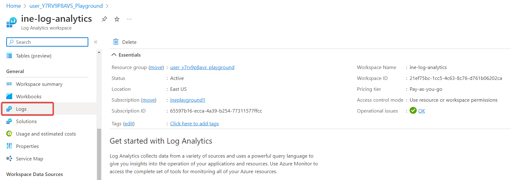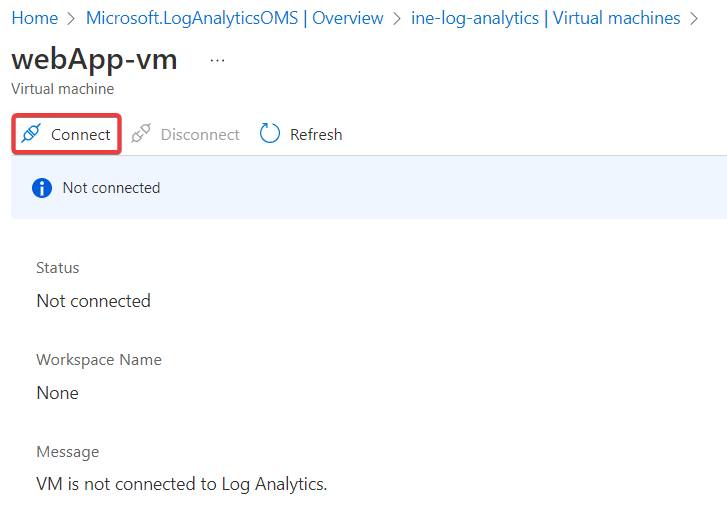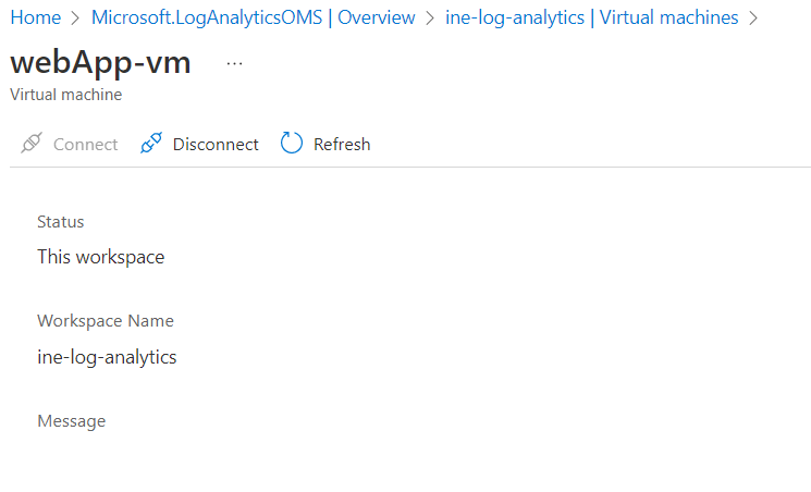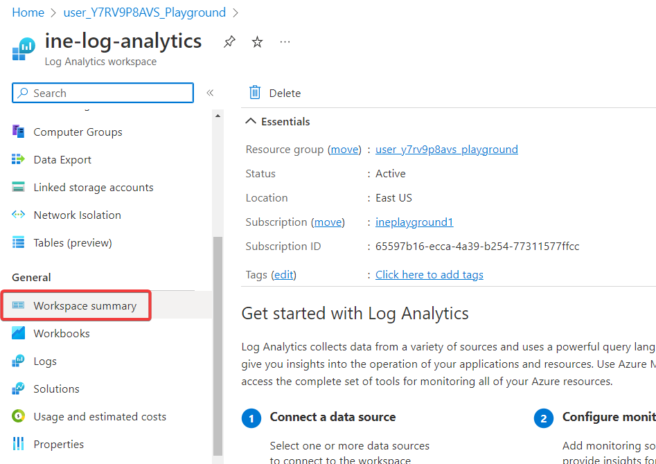 Navigate back and notice the Log analytics connection. It is connected to this workspace.