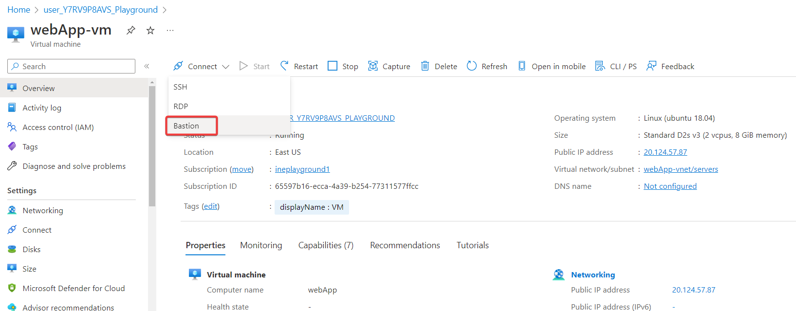 Click on Connect and choose Bastion.