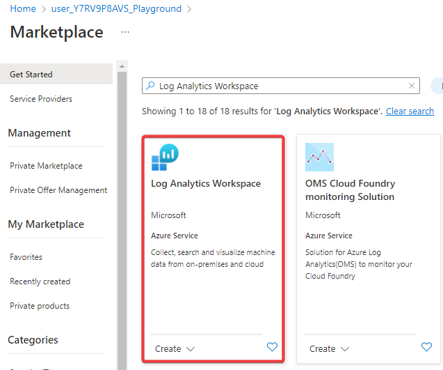 Search for Log Analytics Workspace and click on it.