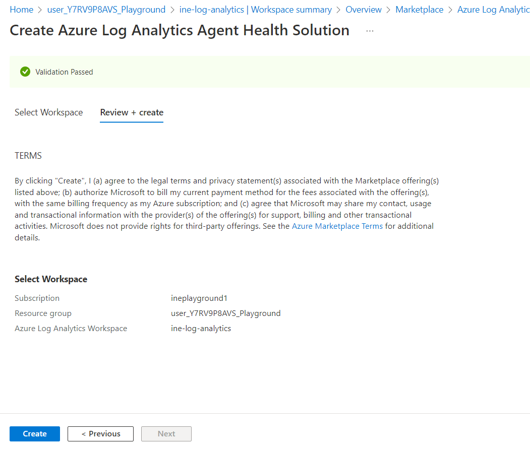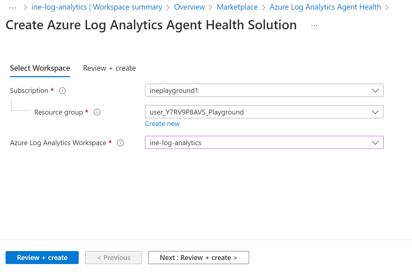 Choose the created log analytics workspace for the configuration and click on Review + create.