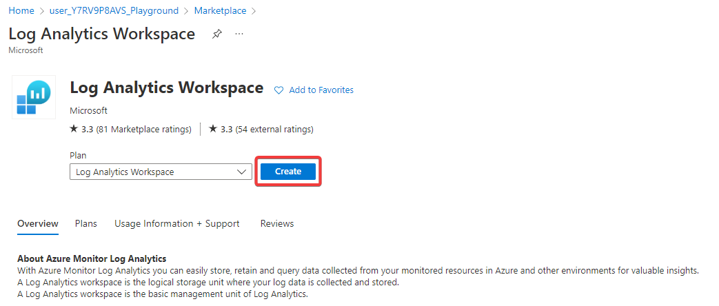 This page will provide an overview of the Log Analytics Workspace. Now click on Create.