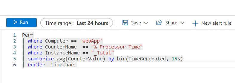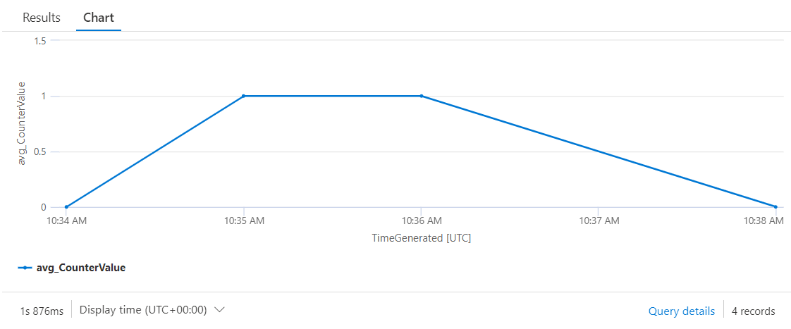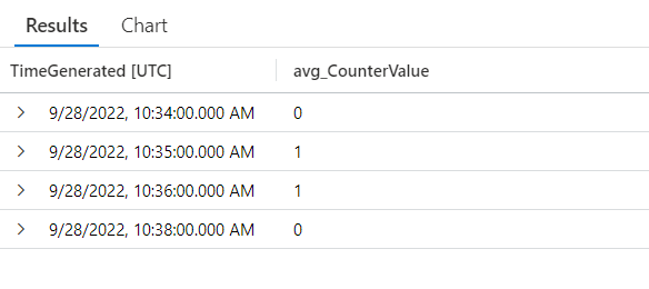 | summarize avg(CounterValue) by bin(TimeGenerated, 15s)
