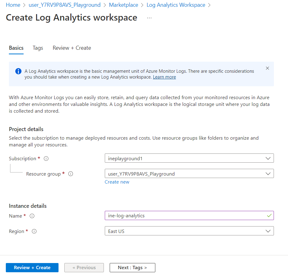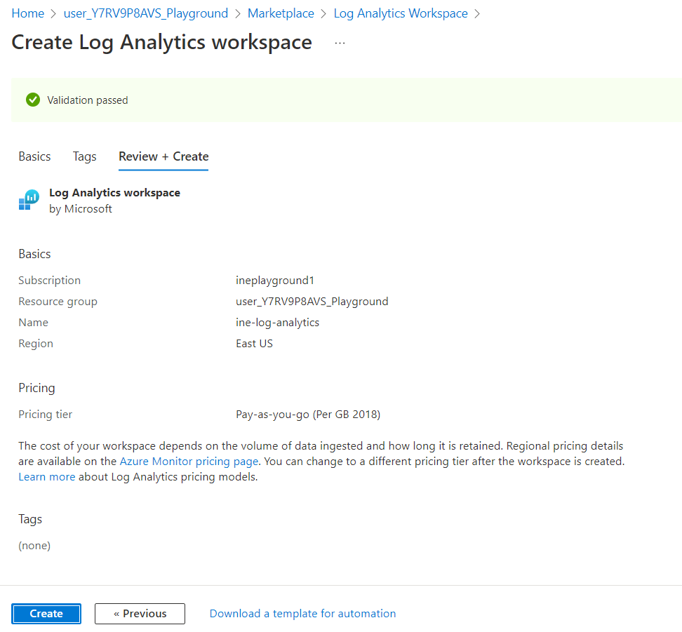 Set any unique name to the Log Analytics workspace and click on Review + Create.