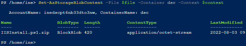 Set-AzStorageBlobContent -File $file -Container dsc -Context $context