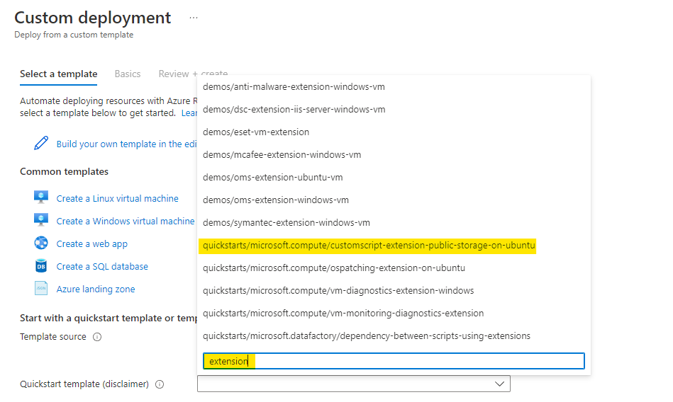 Here search for extension in quickstart templates. So you don't have to write the ARM script from scratch.
