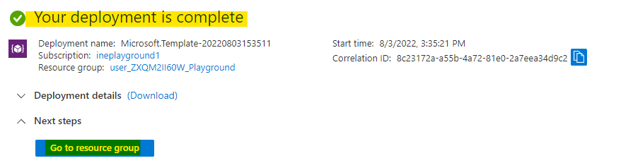 Afte sometime you will see Your deployment is complete. This means everything was deployed. Click on Go to resource group to check the resources you just deployed.