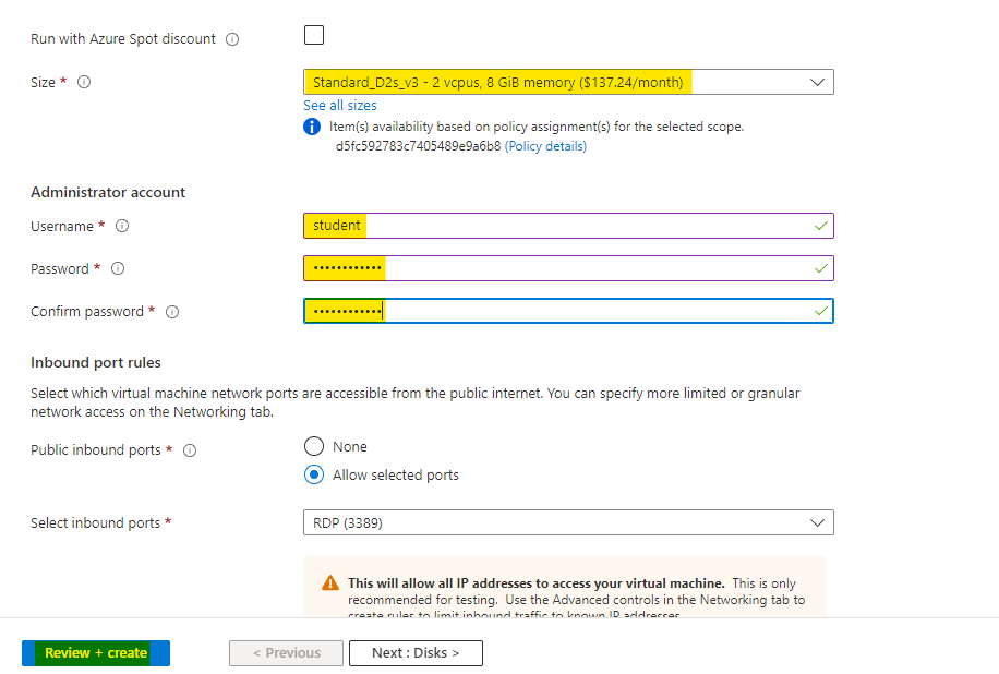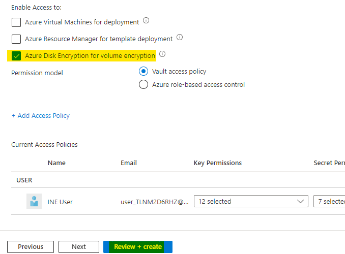 Make sure to check the Azure disk encryption access. Then click on Review + Create.