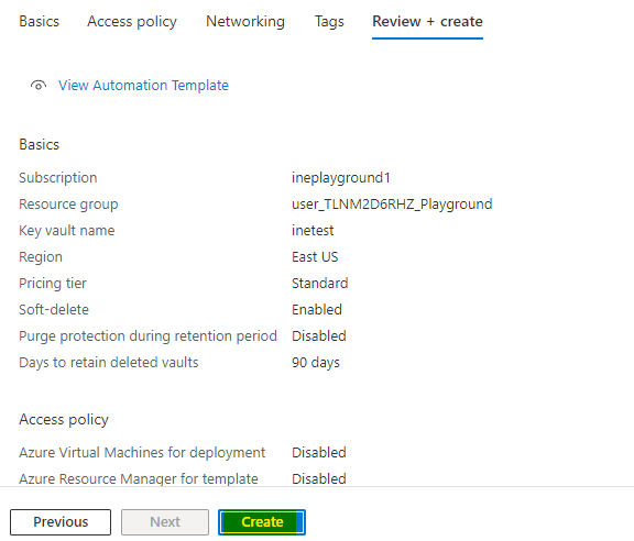 Now Azure will verify your configuration. Click on Create to create the key vault.