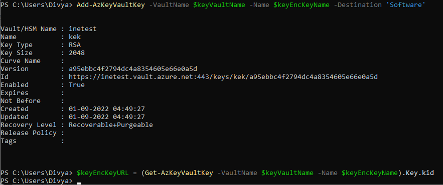 Add-AzKeyVaultKey -VaultName $keyVaultName -Name $keyEncKeyName -Destination 'Software'