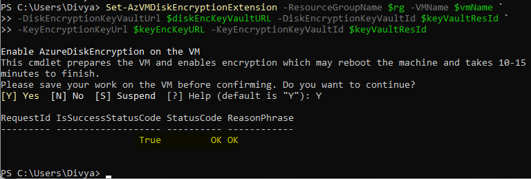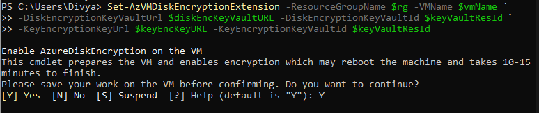 Set-AzVMDiskEncryptionExtension -ResourceGroupName $rg -VMName $vmName `