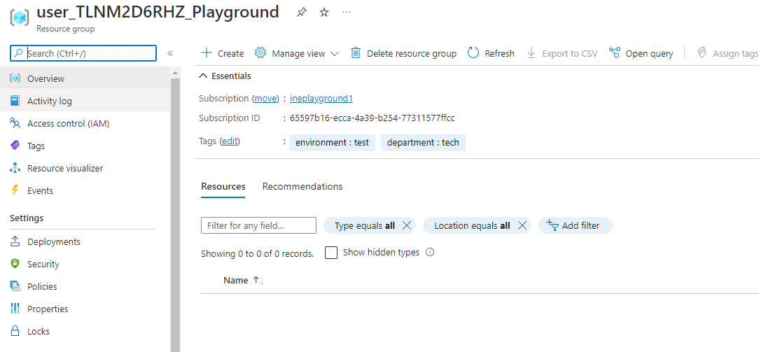 After logging in to portal using the credentials. You will see an empty resource group, where you can create some resources.