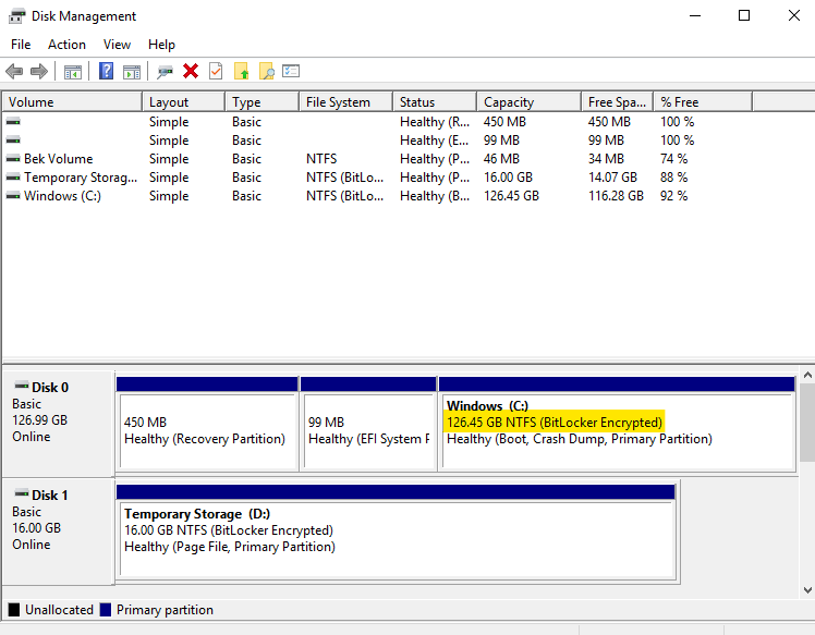 Here you can see that our disk is Bitlocker encrypted. This means that the encryption was successful.