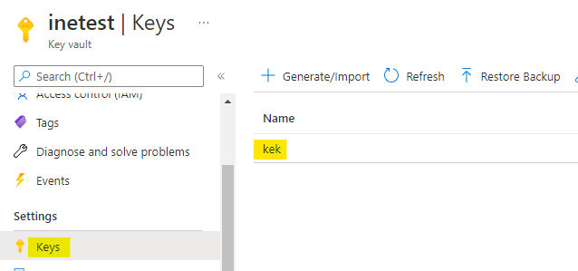 Close the RDP session and navigate to the keys in the key vault. You can see the kek encryption key we created from pewershell.