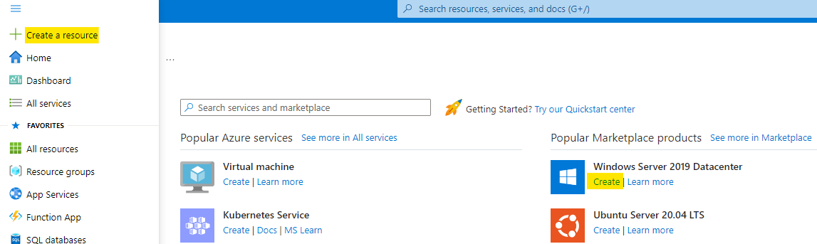 Go to the left top menu and click on Create a resource. Click on Create under the windows server.