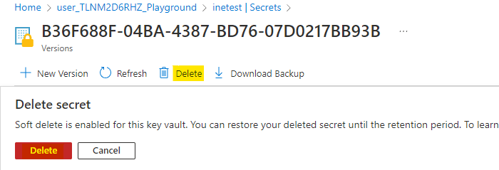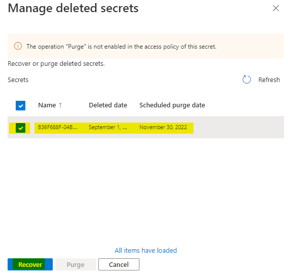 Note: The deleted secrets will purge after 3 months, but you can still recover the secret from the downloaded backup file.