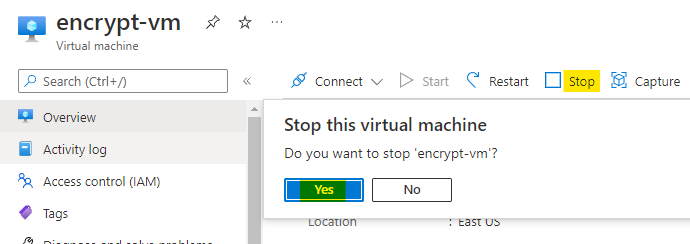 Navigate back to the virtual machine and click on Stop. Click on Yes to confirm.