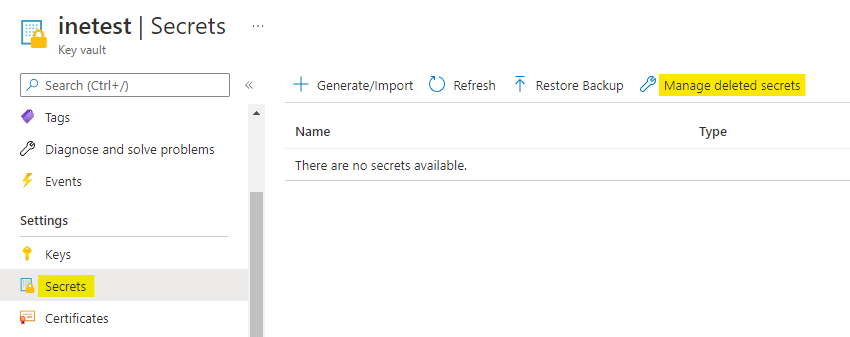 Go back to the secrets of the key vault. Click on Manage deleted secrets.