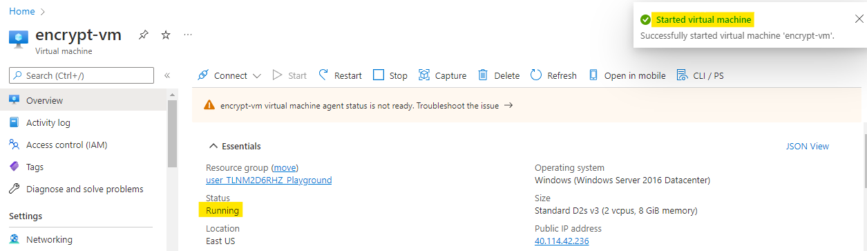 Command is very straightforward, we are encrypting the VM with the generated key of our key vault.