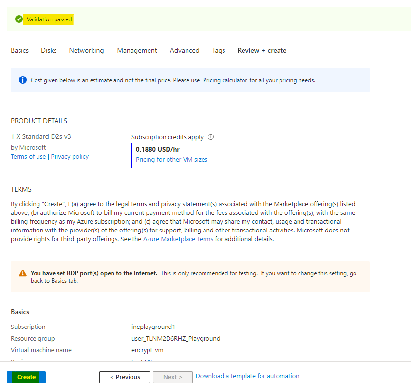 Now Azure will verify your configuration. After sometime you will see Validation Passed that means everything is fine. Click on Create to create the virtual machine.
