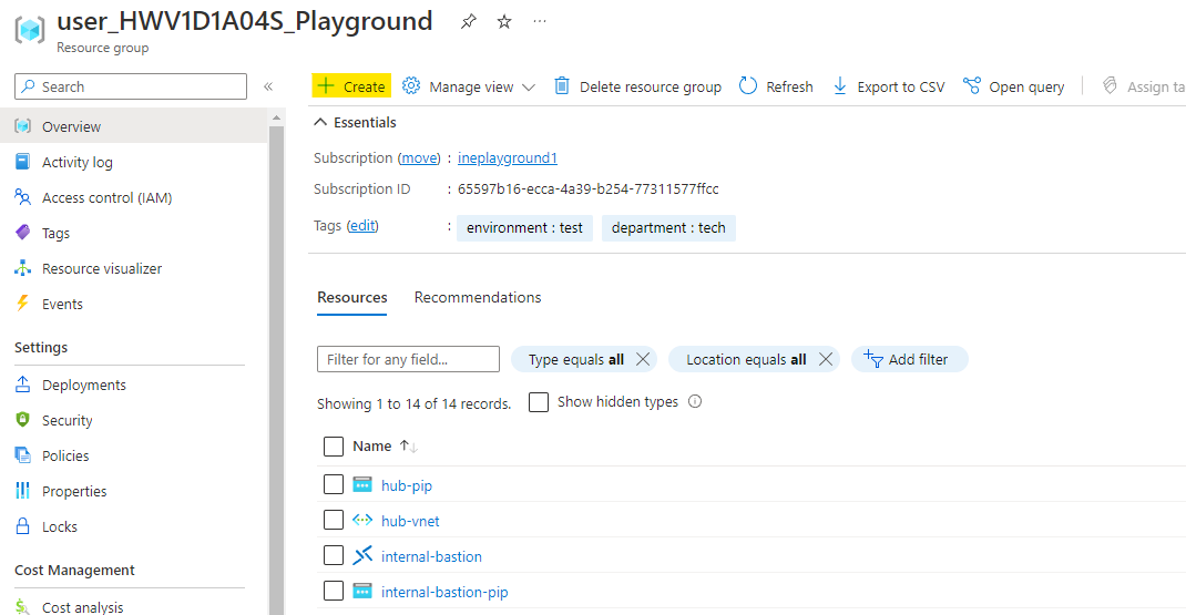 When you will login to the azure with the provided credentials, you will find some predeployed resources. This is all you will need for this lab. Click on Create as highlighted below to create some resource.