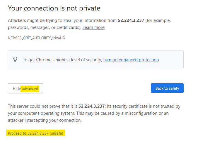 Open this IP address in a new browser tab. Click on Advance and then Proceed to IP to access the pfSense.