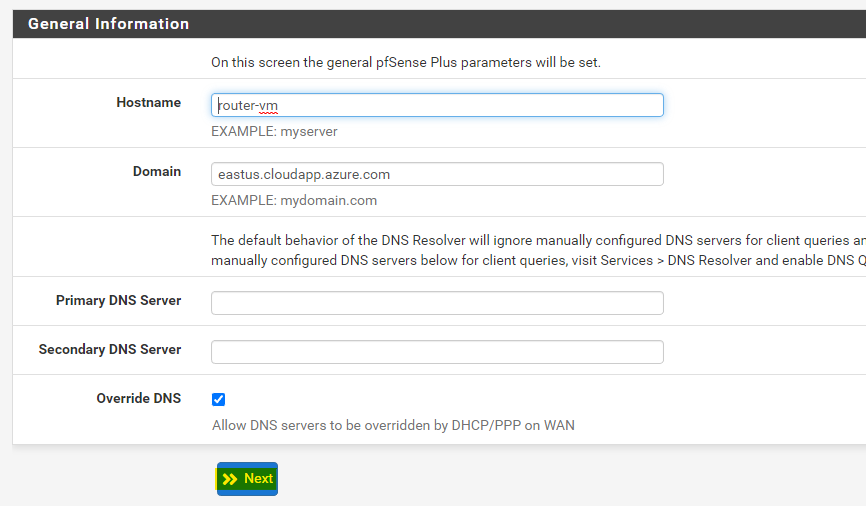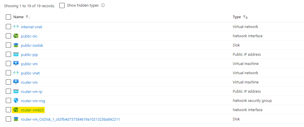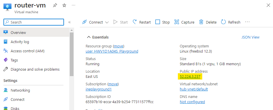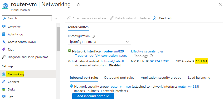 We will also need the private IP address of our router VM. Navigate to the networking of the router VM and copy the private IP address. Which in this case is 10.1.0.4