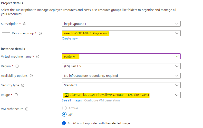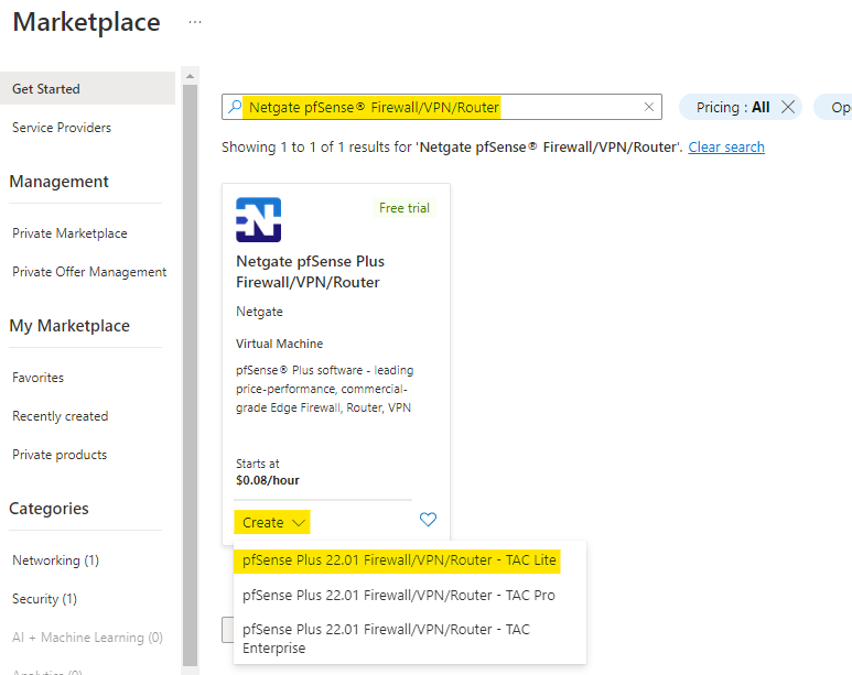 Search for Netgate pfSense® Firewall/VPN/Router and click on create, then pfSense TAC Lite VM.