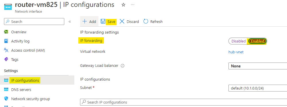 Open the IP configuration of this NIC and enable the IP forwarding. Click on Save to save the changes.