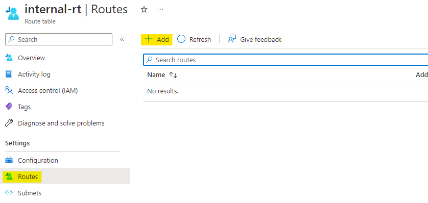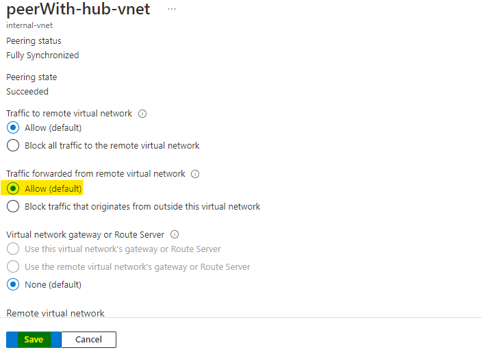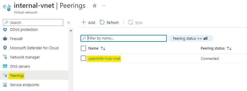 Navigate to the internal vnet and open the Peerings for this vnet. Here open the peering with hub-vnet.