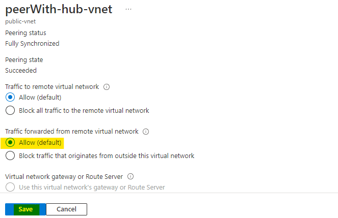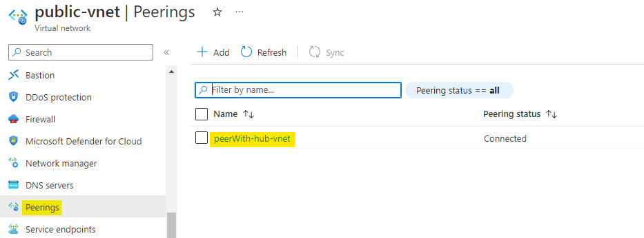 In the same manner navigate to the peerings of public-vnet. Open the peering with hub-vnet.
