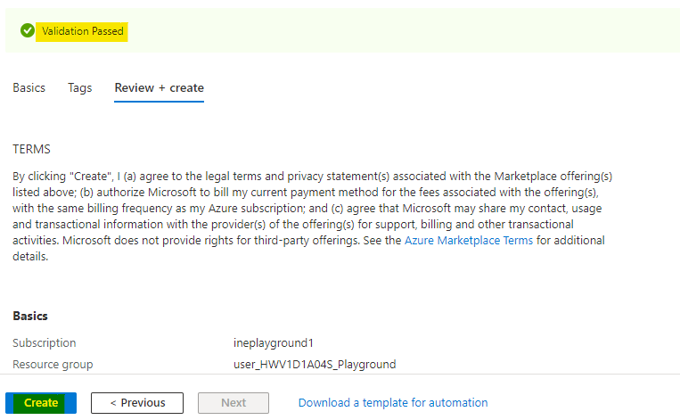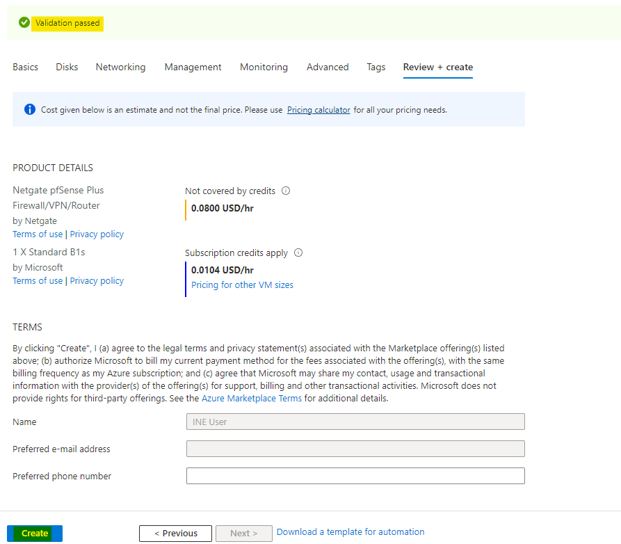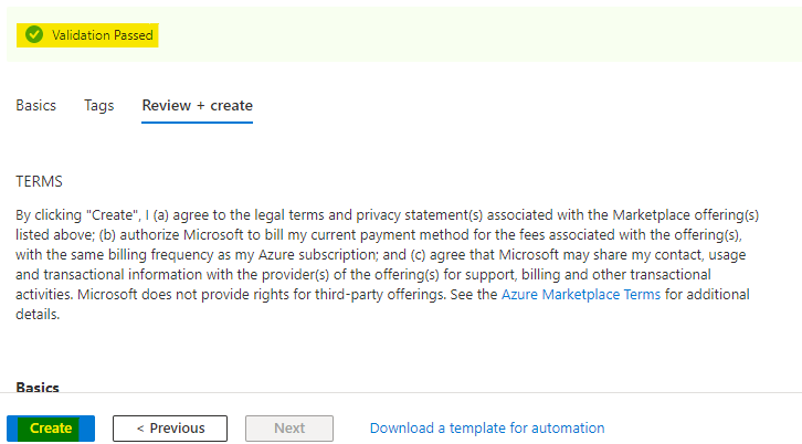 Azure will verify the configuration and it will show Validation passed. Click on Create to provision the virtual machine.