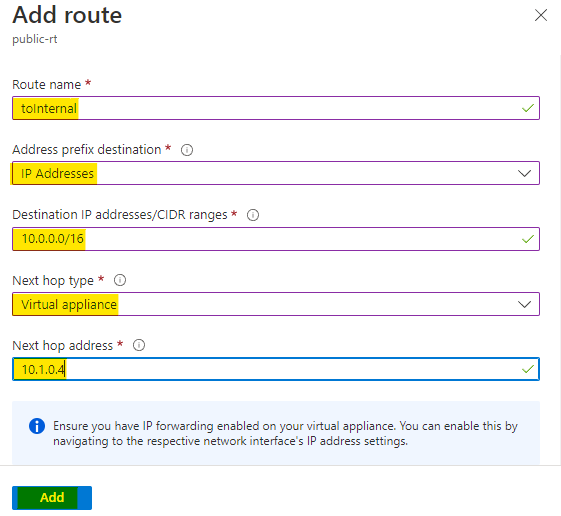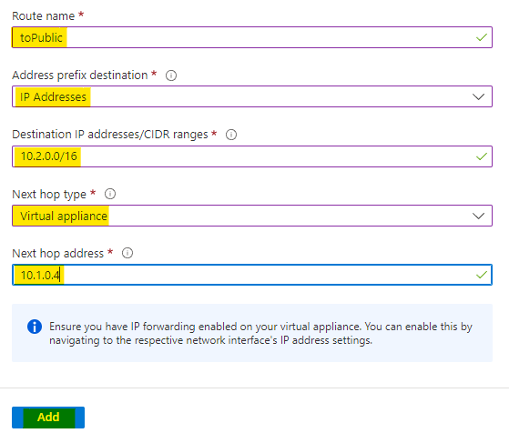 Set the hop address as the private IP address of router VM, which is 10.1.0.4