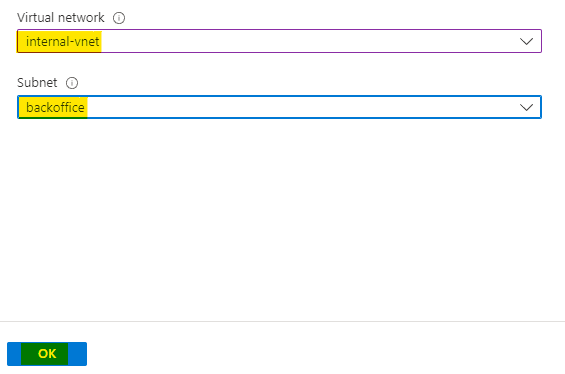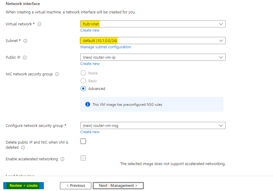Make sure to select the virtual network as hub-vnet and the default subnet.