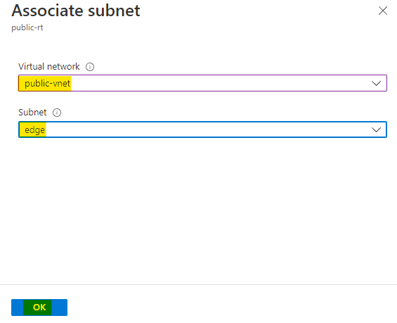 Choose the virtual network as public-vnet and the subnet as edge. Click on OK to associate route table with subnet.