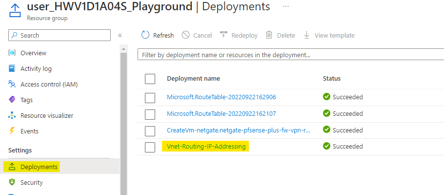 Navigate to the deployments of your resource group and open the Vnet-Routing deployment. This deployment was for pre-requisites.