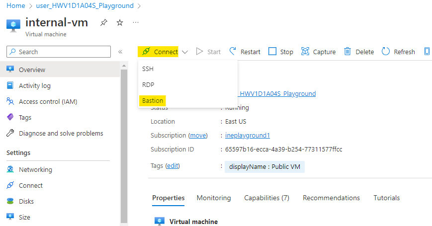 Go to the internal VM and click on Connect. Choose the Bastion option.