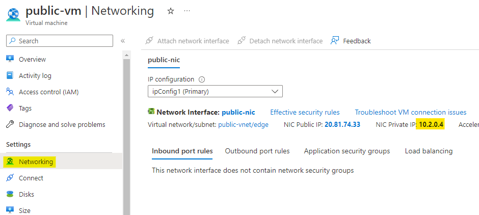 Go back to the portal and check the networking for public-vm. Here copy the private IP address of the VM.