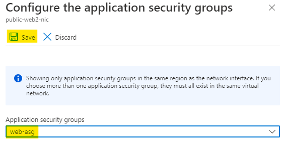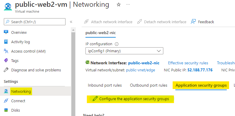 In the same manner, go to the public-web2-vm and open the Networking. Here under Application security groups click on Add asg as highlighted below.