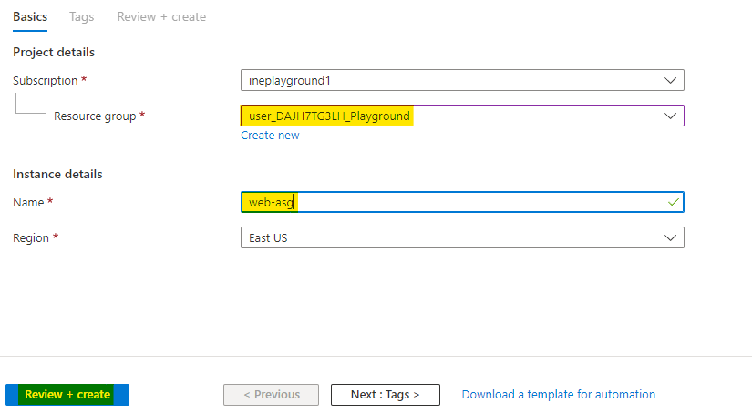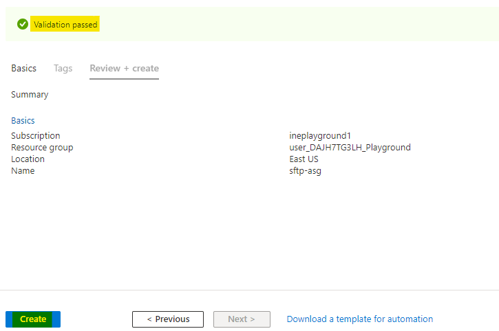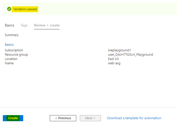 Azure will verify the configuration and it will show Validation passed. Click on Create to provision the ASG.