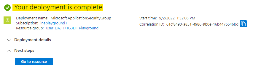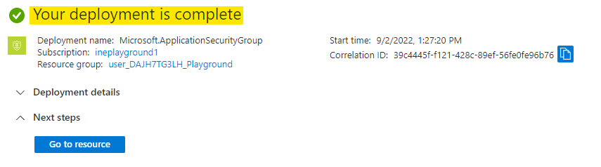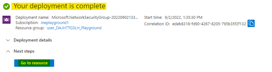 It will take few seconds to deploy the NSG. You will see Your deployment is complete which means NSG is provisioned. Click on Go to resource to check the NSG.