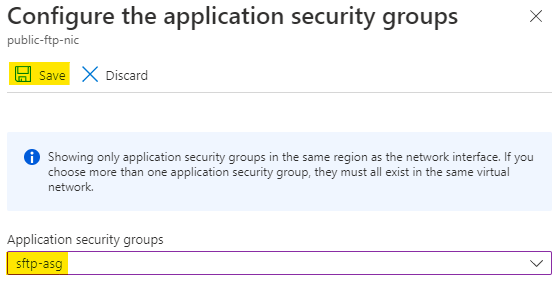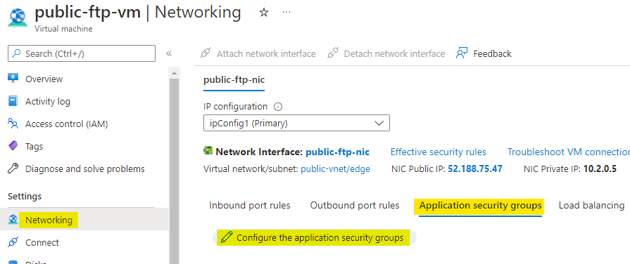 Go to the public-ftp-vm and open the Networking. Here under Application security groups click on Add asg as highlighted below.
