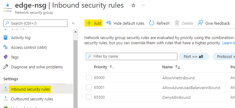 Here navigate to Inbound security rules and click on Add to add new rule.