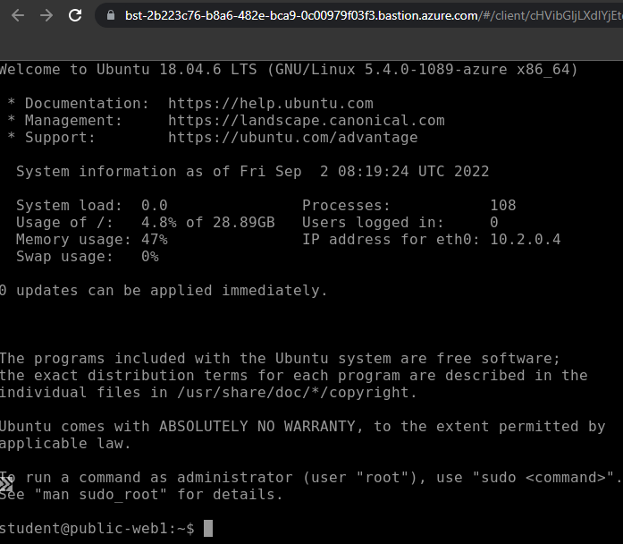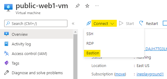 Navigate to the either of web-vm and click on Connect. Choose Bastion option to connect.