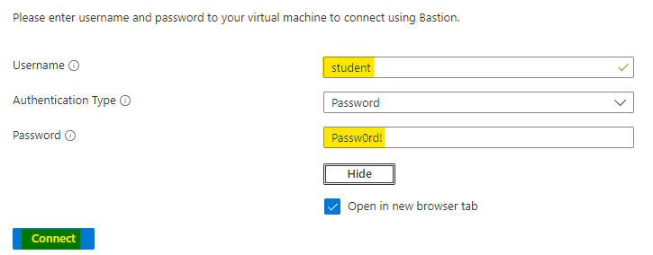 Use the student username and Passw0rd! password to connect to the VM. Click on Connect.
