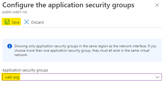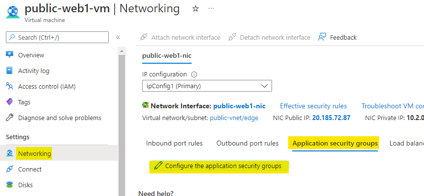 Go to the public-web1-vm and open the Networking. Here under Application security groups click on Add asg as highlighted below.